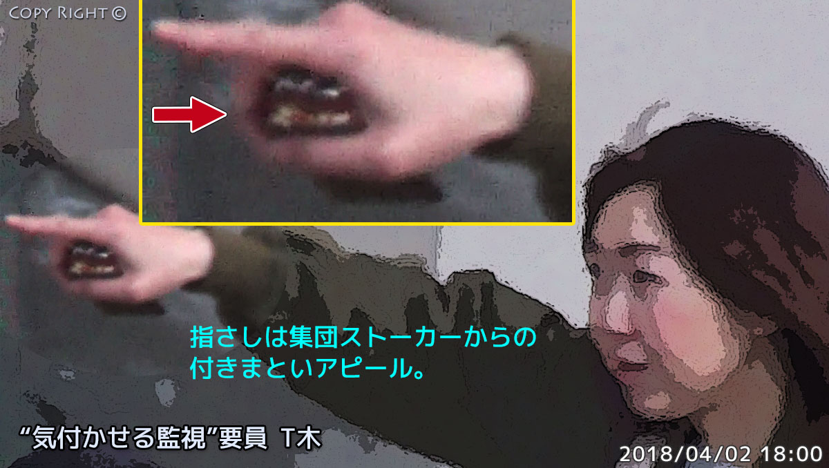ターゲット近辺に工作員を潜伏させたり通行中の経路に工作員を配置して、24時間365日意図的な監視的行為を連続発生させ、ターゲットに対して監視されている事を刷り込んだりする行為です。表向きの理由はターゲットに「監視を気付かせる」というような趣旨になりますが、裏向きの理由はターゲットをキレさせる目的で実行します。