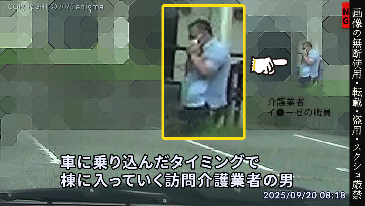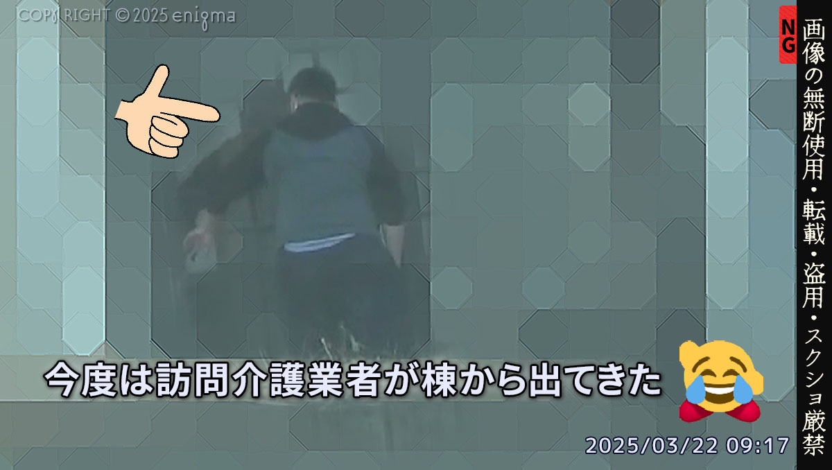 「姿を見せながらの尾行」、「ターゲットと同じタイミングで出入りする」などは、T木を始めとする特定の団地住民や出入りしている介護業者などの行動そのものです。
