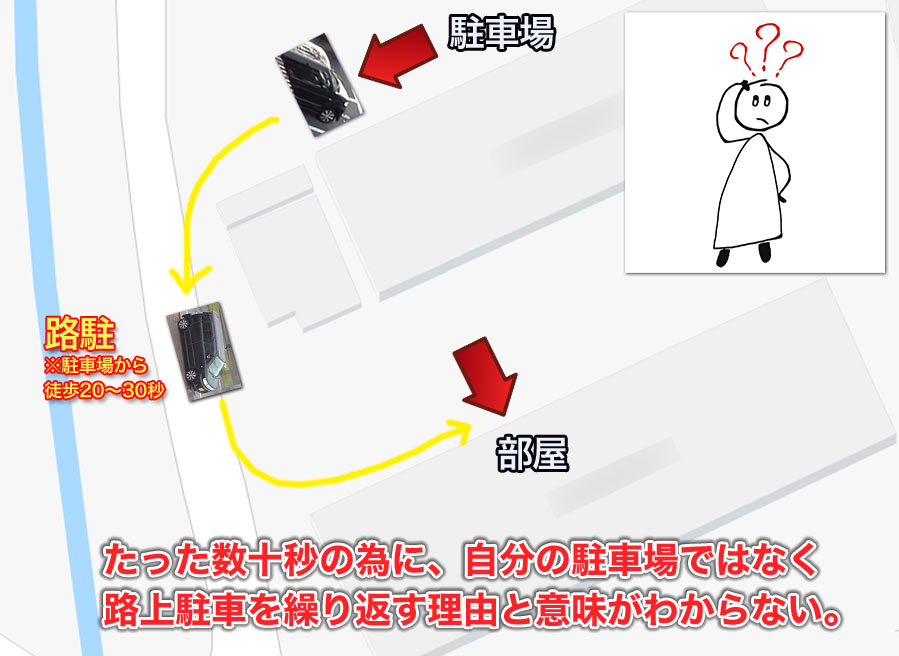 たかだか60~70m歩くのが嫌だから路駐するとか、頭の中で良からぬ植物でも栽培しているんでしょうかね。